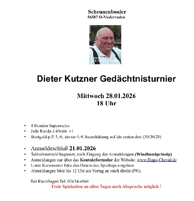 Im Oktober finden in der Boulescheune Niederraden folgende Turniere statt: Freitag, 10. Oktober und Freitag, 24. Oktober, 17 bis 21:00 Uhr Supermelée. Bei allen Supermelée Wettbewerben werden 4 Runden á 45min. +1 Aufnahme gespielt. Startgeld 4,-€, davon 2,-€ Ausschüttung (50-30-20% gerundet) 1,-€ Jackpot. Anmeldetag ist immer Montag vor dem Spieltag. Anmeldungen nur über das Kontaktformular der Website: www.Hugo-Cheval.de Bei Rückfragen Tel: 02634-4966 oder email: scheunenbouler@t-online.de Im November finden neben den 14-tägigen Supermelées folgende Turniere, hier zum Download, statt: